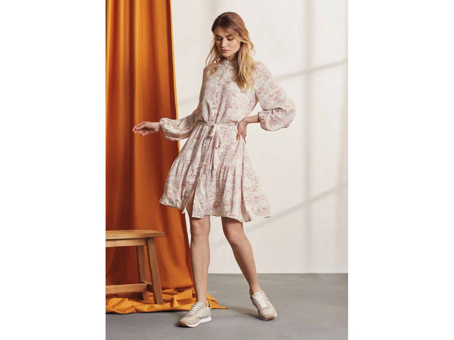 طرح گلهای ظریف روی زمینهای روشن، حس لطافت و بهاری به استایل شما میدهد. یقه ایستاده دکمهدار، آستینهای بلند و بند کمر قابل تنظیم، این لباس را به انتخابی کاربردی برای فصلهای گرم تبدیل کرده است. فرم آزاد و راحت آن باعث میشود در طول روز احساس خنکی و آرامش داشته باشید.